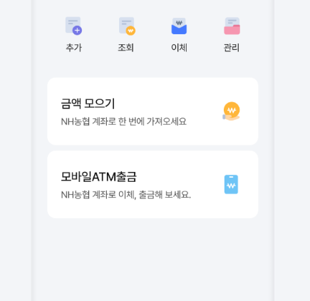 NH콕뱅크는 농협 인터넷뱅킹보다 더 단순한 기능 중심으로 구성된 초간편 금융 앱입니다.